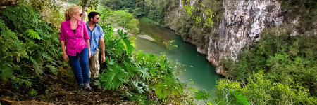 Der Wanderweg zum Balcón de Iberia, ca. 25 km nördlich von Baracoa, beginnt in dem kleinen Ort Santa María, wo Sie den gleichnamigen Fluss überqueren. Während der Wanderung durch den Humboldt-Nationalpark CUNP002 erleben Sie zusammen mit Ihrem Reiseleiter die üppige Flora und Fauna, etliche Tier- und Pflanzenarten sind endemisch und kommen nur hier vor. Die Vielfalt der Vogelwelt ist erstaunlich, Papageien, Tocororo und Bienenelfe (zunzuncillo) können mit etwas Glück beobachtet werden.