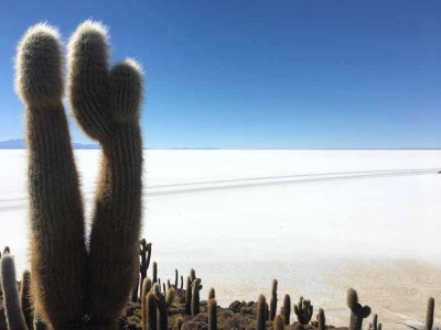 Auf dem grössten und schönsten Salzsee, dem "Salar de Uyuni" BOAK001 gelangen Sie vorbei am alten Salzhotel mit dem benachbarten “Internationalen Fahnenwald” bis zur Insel Inkahuasi BOAK002 mit ihren tausenjährigen Kakteen. Vom höchsten Punkt der Insel aus haben Sie einen atemberaubenden 360 Grad Rundblick über das Meer aus Salz. Am Rand der Insel geniessen Sie ein typisches Mittagessen mit lokalen Speisen und bolivianischem Wein.
