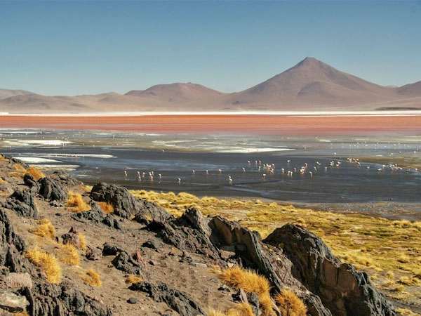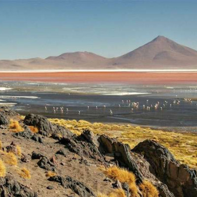 Nach dem Frühstück brechen Sie zur Tour durch das "Tibet Südamerikas" auf. Über die Salzwüste von Chiguana gelangen Sie zum rauchenden Vulkan Ollague. Der Tun Tun Pass verbindet die Silberstrasse mit den Hochlandlagunen Cañapa, Hedionda, Chiarcota, Honda und Ramaditas. Hier können wir die schönen farbigen Anden-Flamingos beobachten und fotografieren. Angesichts der vielen Sehenswürdigkeiten haben Sie immer wieder Gelegenheit, das nähere Umfeld zu erkunden, sich die Füße zu vertreten und Fotos von der faszinierenden Landschaft zu machen. Nach der Überquerung des Inkapasses kommen Sie in die Siloli Wüste mit den Steinbäumen und dem Berg der sieben Farben. Die mit 60 km² größte Laguna Colorada BOAK003 beeindruckt durch Farben, Schönheit und reiche Fauna. Ein weiterer Höhepunkt bietet das Geysirfeld "Sol de Mañana", wo die Erde farbenfroh kocht.