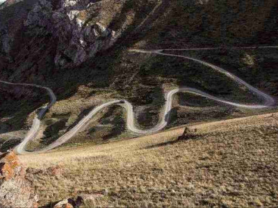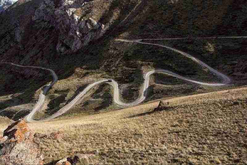 Nach dem Frühstück in der Jurte radeln wir zunächst etwa 10 km relativ flach am See entlang. Danach folgen einige kurze, steile Anstiege bis zum Pass. Von dort genießen wir einen fantastischen Ausblick auf die Serpentinen des 33-Papageien-Passes. KGNP011