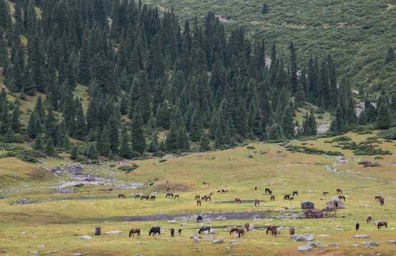 Oben auf dem Pass, auf etwa 3.300 Metern Höhe, genießen wir ein Picknick-Mittagessen, bevor wir unsere Fahrt in Richtung Song-Kul-See KGNP002 fortsetzen. Die Strecke verläuft in Wellen – überwiegend bergab, mit einigen kurzen Anstiegen. Die umliegenden grünen Hügel sind gesprenkelt mit Jurten, Schafherden und gelegentlich Rindern – aber vor allem sieht man viele Pferde.