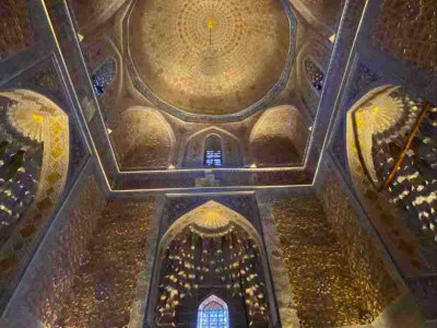 In Samarkand angekommen, unternehmen wir eine Stadtrundfahrt durch die geschichtsträchtige Stadt, in der Kultur und Vergangenheit lebendig sind. Der Registan, das Herz der alten Stadt, beeindruckt mit seinem monumentalen Ensemble aus drei Medresen. Azurblaue Kuppeln und kunstvolle Mosaike leuchten im Sonnenlicht. Ulugh Beg, Sher-Dor und Tilla-Kari erzählen jeweils ihre eigene Geschichte mit schimmernden Majolika-Fliesen, goldenen Ornamenten sowie hohen Arkaden und Minaretten.