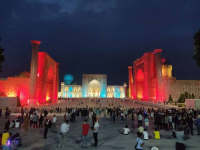 Am Abend verzaubert der beleuchtete Registan-Platz mit märchenhafter Atmosphäre und der Magie des alten Samarkand.