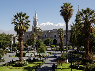 Arequipa liegt weit südlich von Lima in einem fruchtbaren Tal zwischen Wüste und Gebirge. Einst war es wichtigte Bahnstation auf der Verbindungsstrecke der Silberminien Boliviens und der peruanischen Küste. Die „weiβe Stadt“ ist das zweigröβte urbane Zentrum Perus und mit seinen prachtvollen Kolonialbauten aus „weiβem“, vulkanischen Sillar-Gestein ein touristischer Höhepunkt. Einer Legende zufolge war der Inkaherrscher Manco Capac auf einer seiner Reisen von der Schönheit des Tales so angetan, dass er sein Gefolge mit den Worten „ari quipay“ (ja, hier bleiben wir) anhalten ließ und die Stadt gründete.