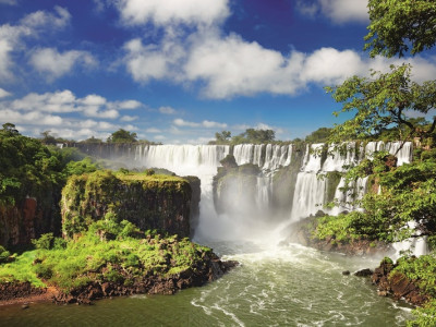 Auf der brasilianischen Seite der Fälle haben Sie einen wahren Panoramablick - von einer Aussichtsplattform nahe an der Teufelsschlucht erlebt man die Fälle aus nächster Nähe. Ein schmaler Steg führt zur unteren Steilstufe der Wasserfälle. Dort ist man umgeben von tosendem Wasser, Nebel und spritzender Gischt, dem Grün des Dschungels, entwurzelten Bäumen und einem halbkreisförmigen Regenbogen.